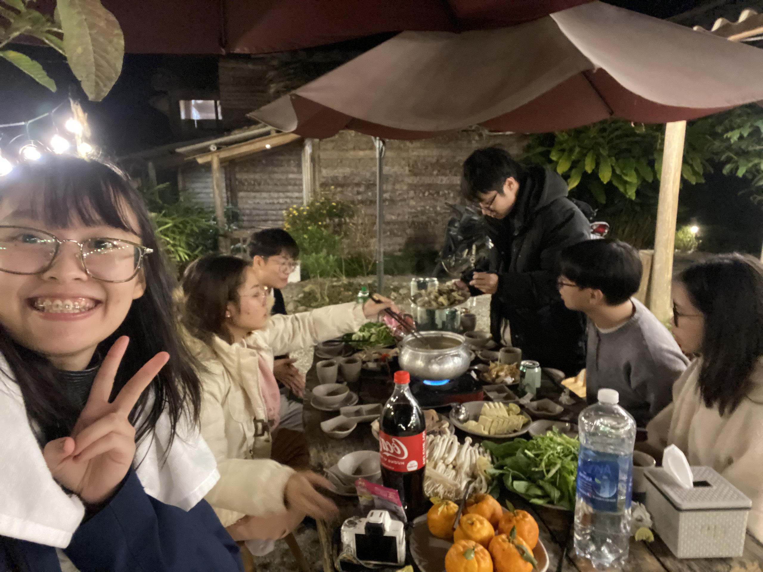 Tại Toce, sau một ngày dài, chúng tớ đã có thời gian để tắm rửa và nấu ăn. Đôi khi, còn bị những cú nhảy áp, hoặc thậm chí là mất điện giữa bữa ăn, nhưng không làm mất đi niềm vui. Khi bữa ăn vẫn chưa đủ cồn, chúng mình đã có dịp giao lưu với các bạn cùng homestay, những sinh viên đến từ trường Bách Khoa Đà Nẵng, bất ngờ là họ cũng 2000 giống tớ z. Sự đáng yêu và thân thiện của họ đã tạo nên một cuộc trò chuyện vui vẻ, phần nào xua tan đi cái lạnh của đêm tối. Cảm giác được chia sẻ, được kể chuyện và cười đùa cùng nhau là một phần không thể thiếu trong chuyến đi này.