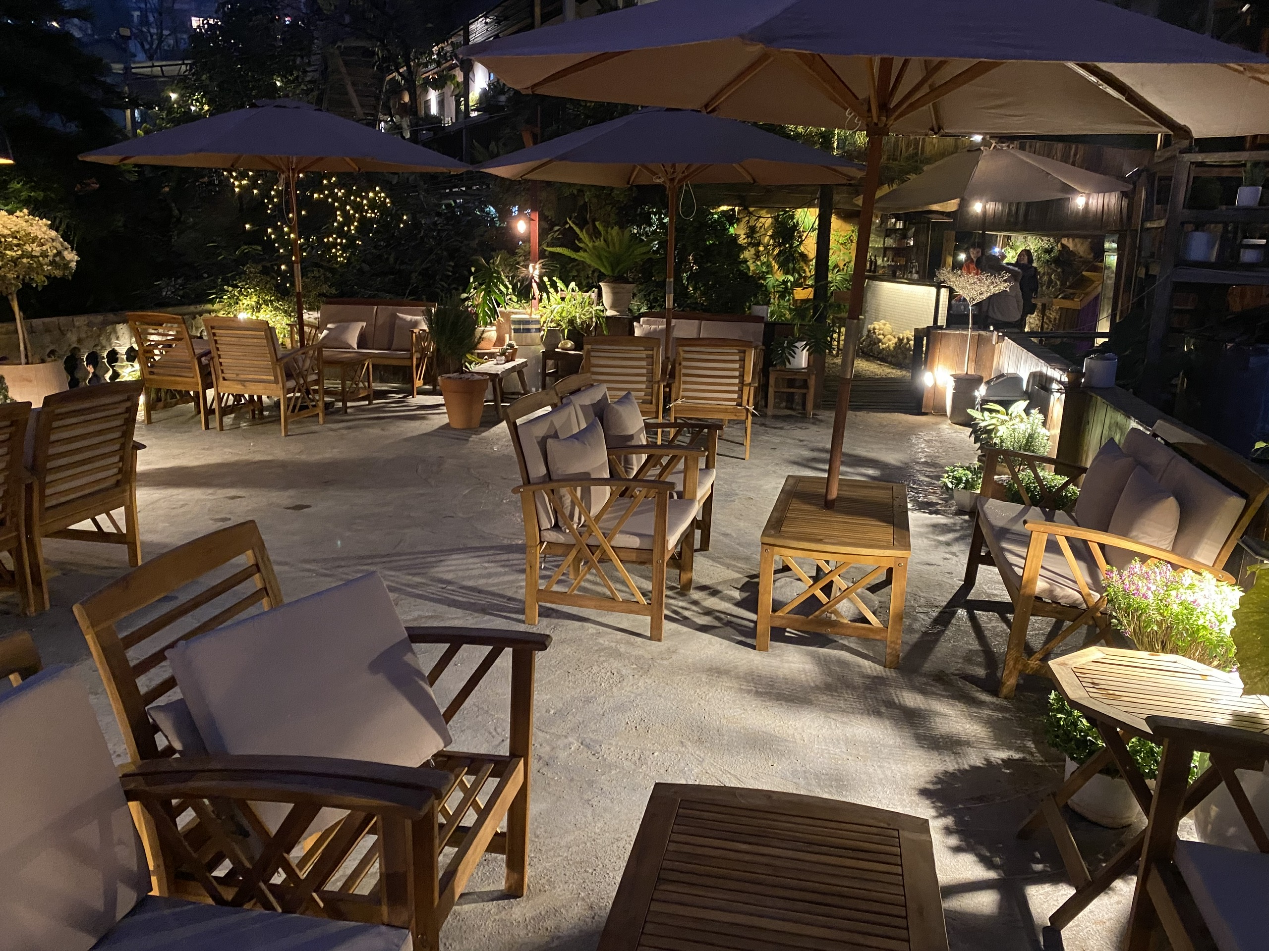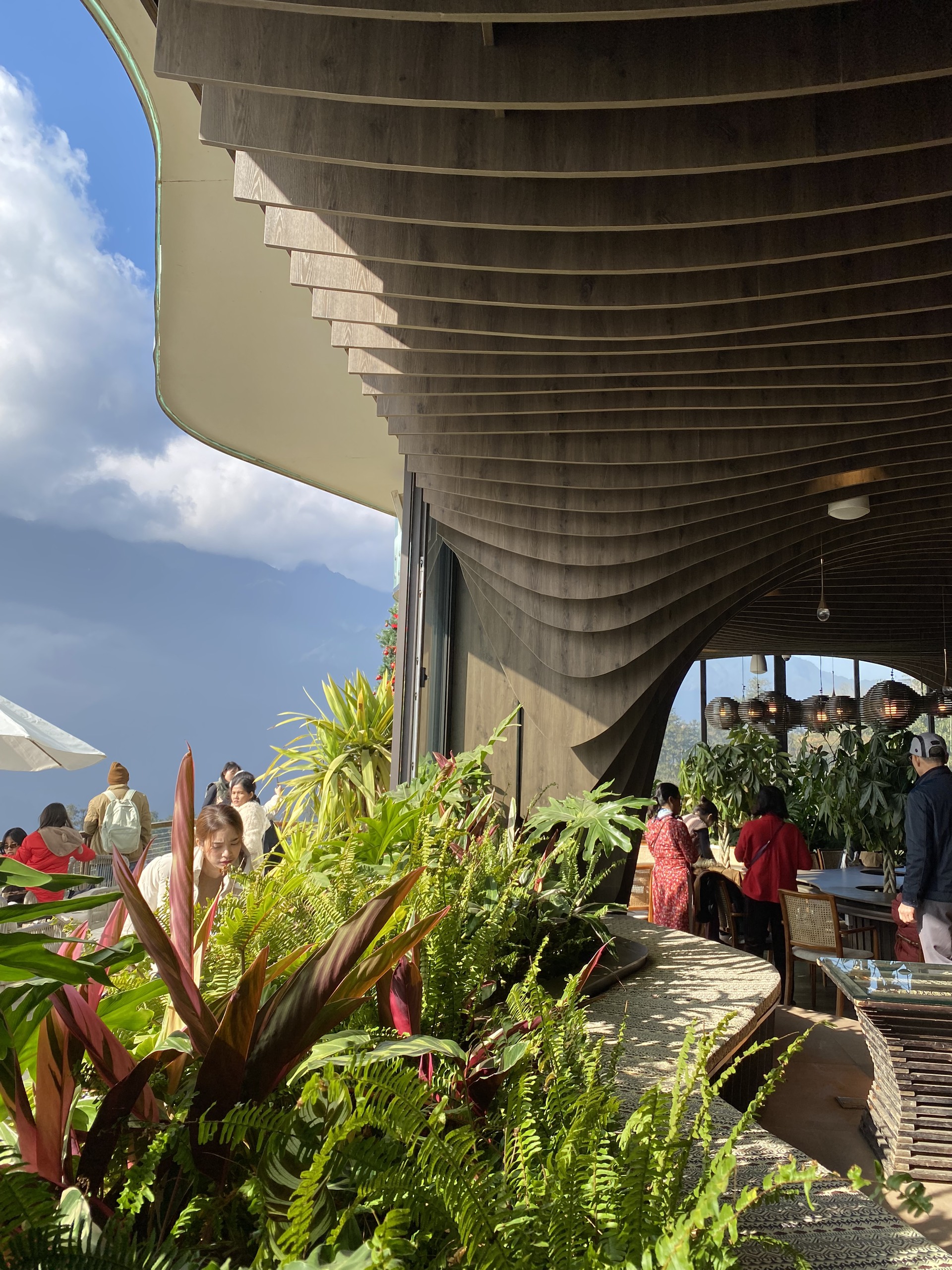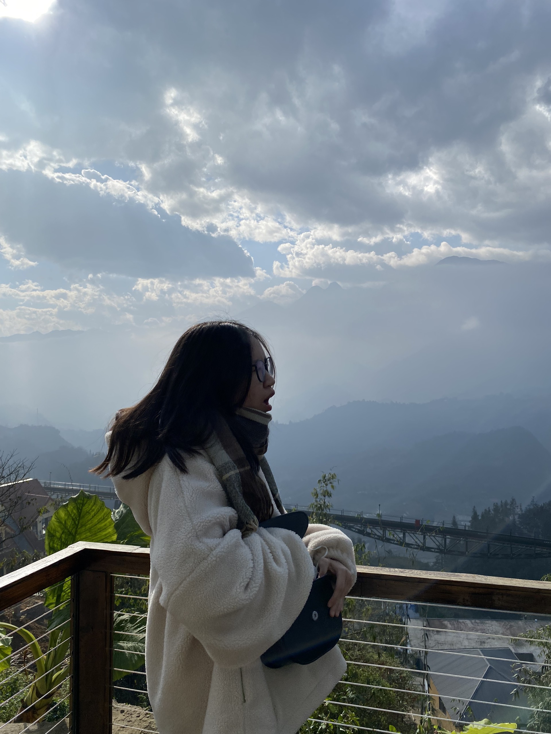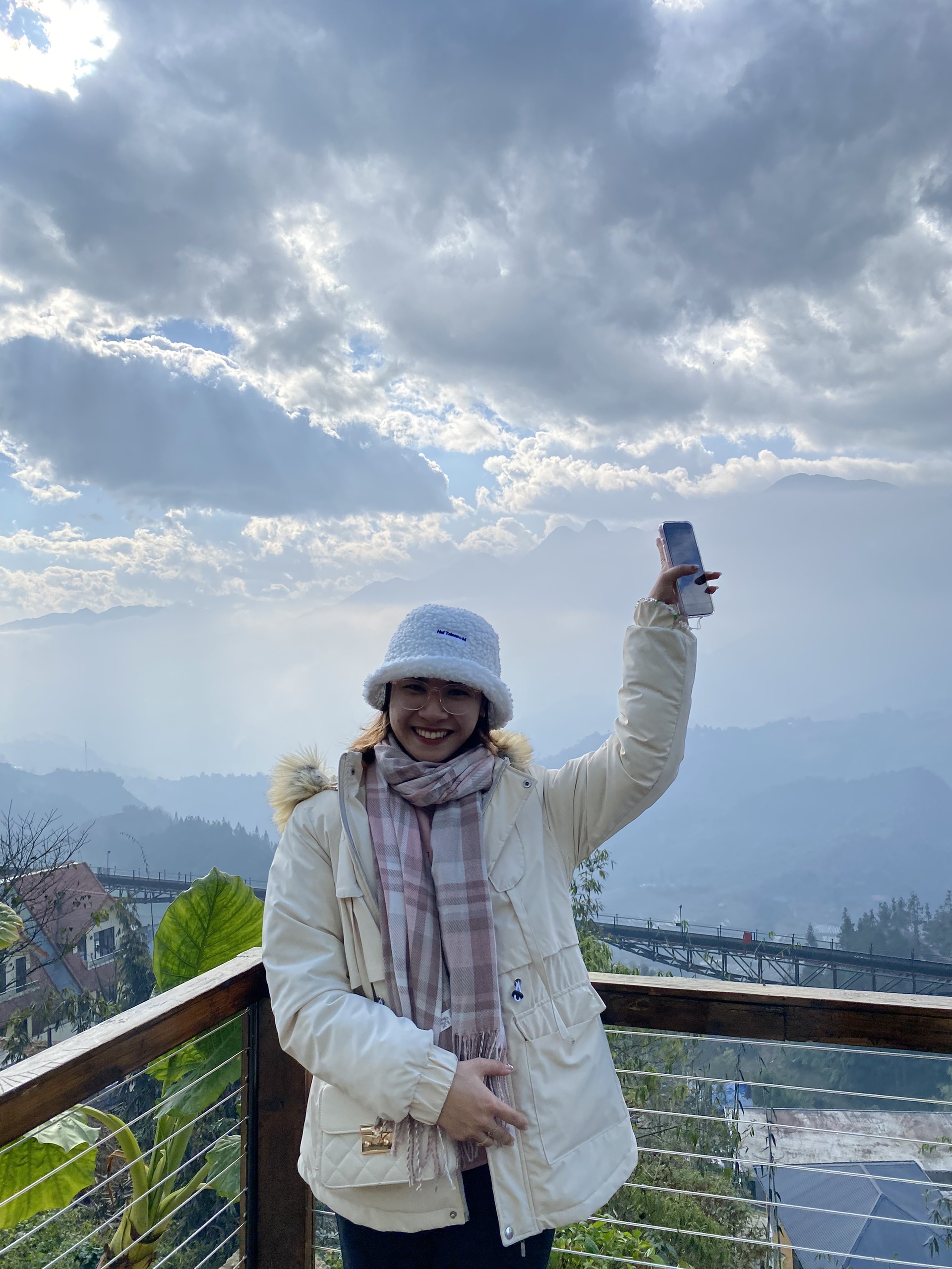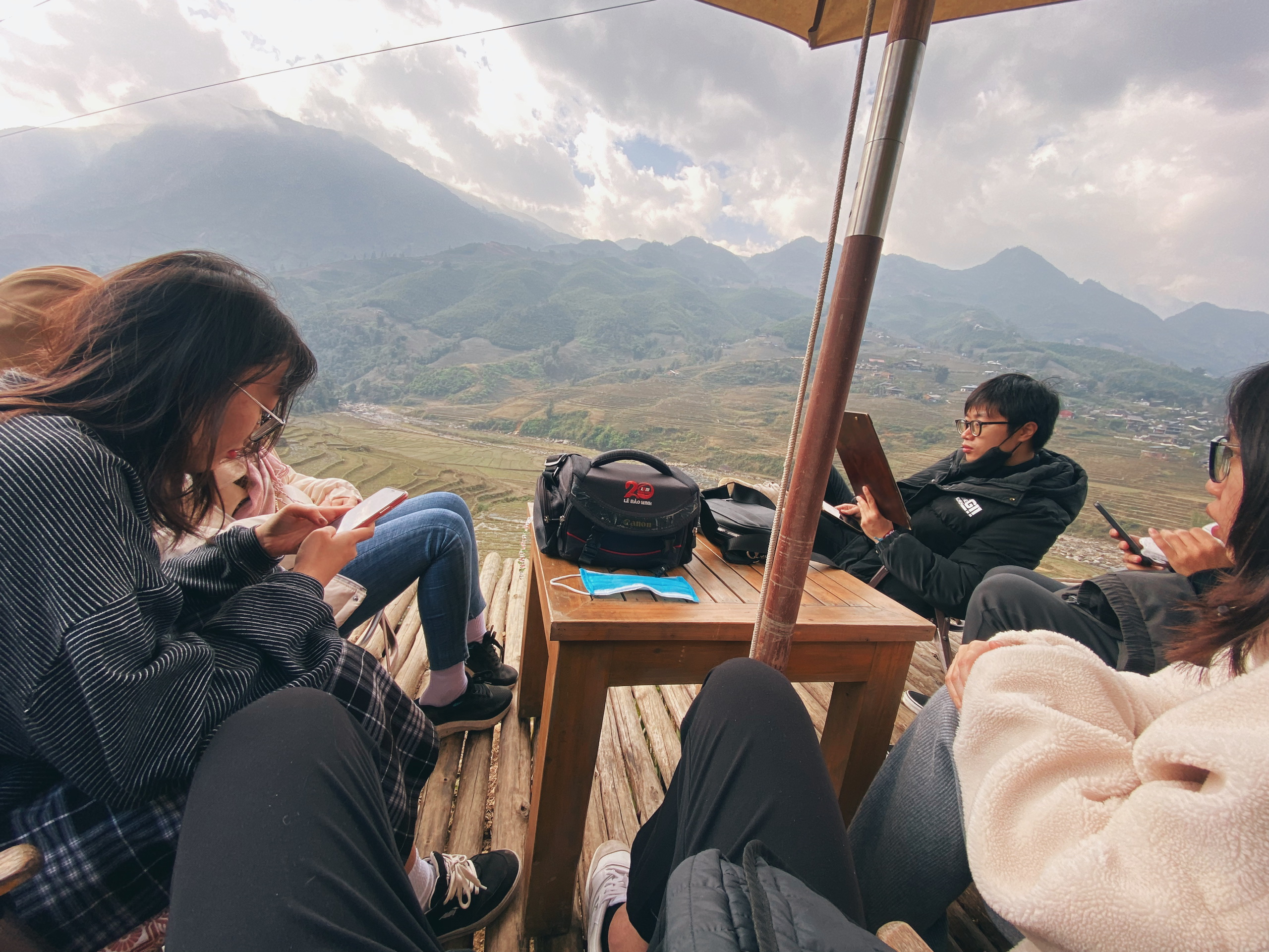 Sau bữa sáng, chúng tớ đã ghé qua tiệm VietTrekking Sapa, một tiệm cà phê nhỏ nằm trên đường đi lên dãy Hoàng Liên Sơn. Đường đến tiệm hơi hẹp và dốc, nhưng khi đến nơi chúng mình đã bị choáng ngợp bởi view tuyệt đẹp của tiệm. Tiệm được xây sát vách núi, có ban công nhìn thẳng ra đường tàu và những ngọn núi phủ đầy tuyết (trong mơ).