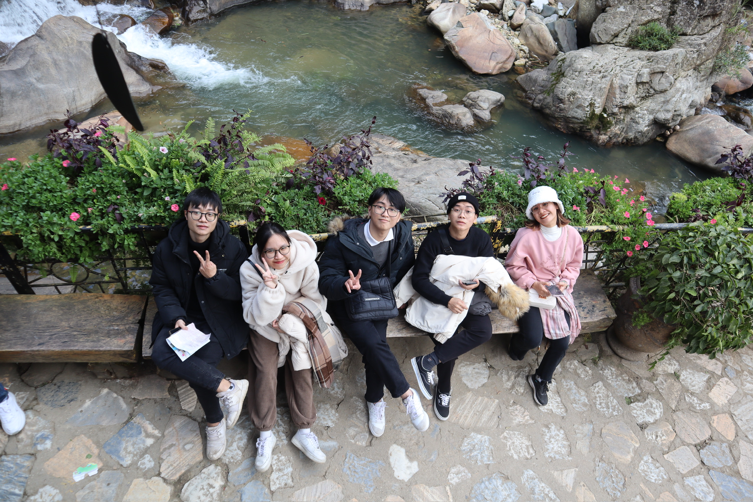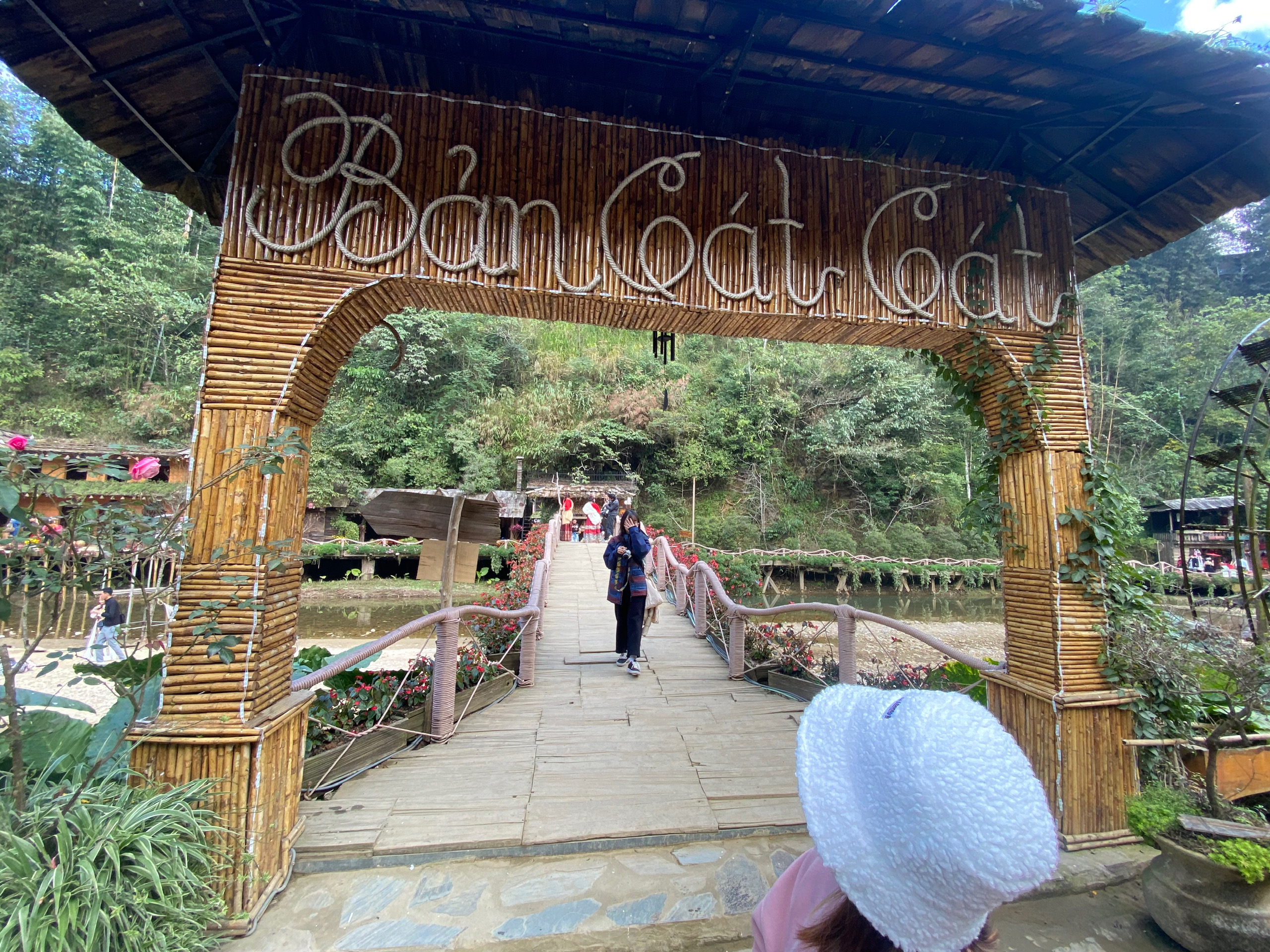 Bản Cát Cát là một ngôi làng đẹp và bình yên, nằm giữa những cánh đồng ruộng bậc thang xanh mướt. Đoàn đã đi qua những con đường bậc thang lát đá, tham quan nhà cổ của đồng bào H'Mong, ngắm nhìn những khu vực tổ chim và vườn hoa hồng. Chúng mình cũng đã chụp nhiều hình đẹp với những bông hoa đào và hoa ban. Để vào trung tâm bản, chúng tớ đã đi qua hai cây cầu treo nhỏ, là cầu Si và cầu Tình. See Tình 😊