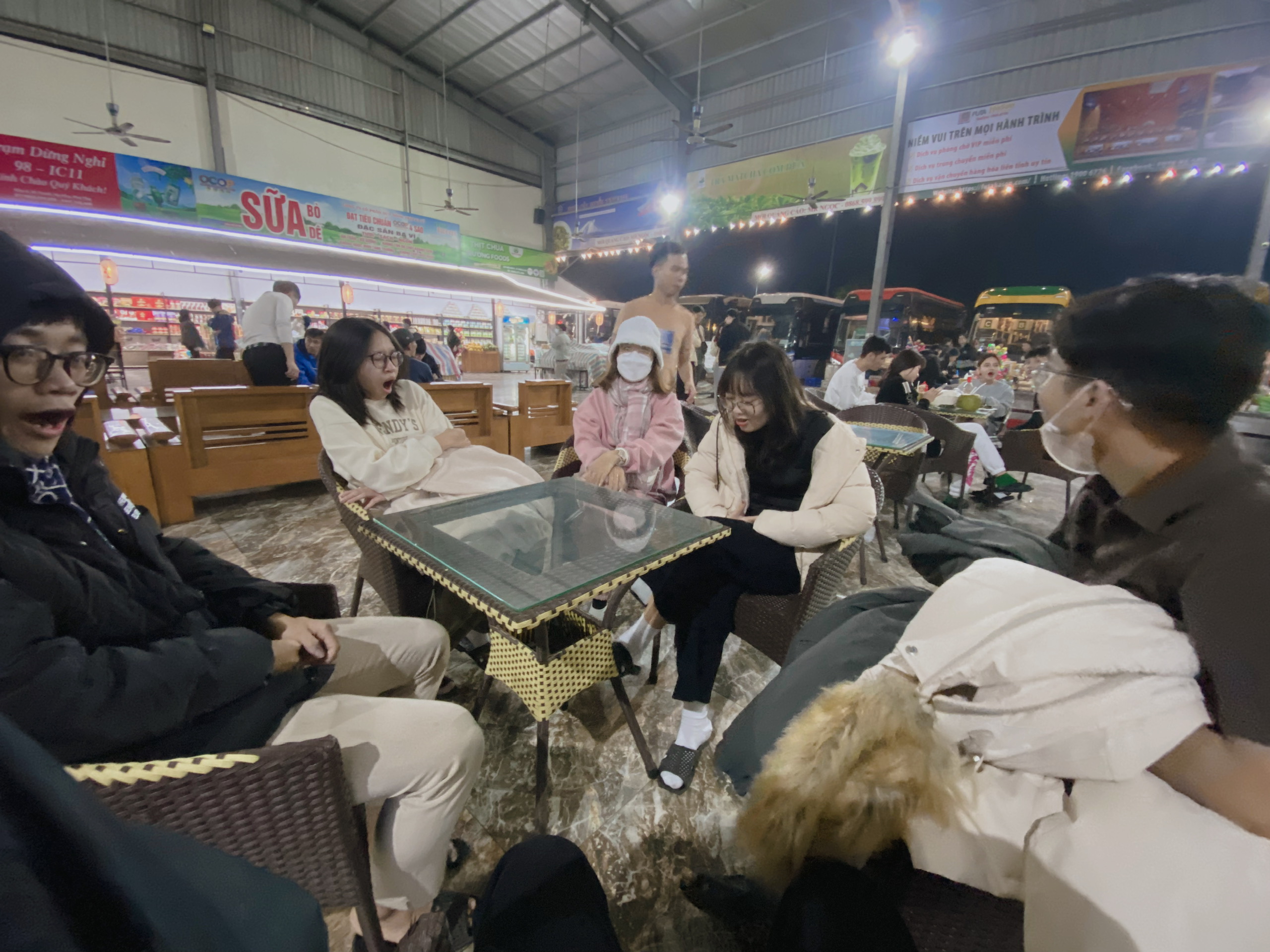 Khoảng nửa đêm, xe dừng lại ở một trạm dừng nghỉ. Mình cũng xuống xe để tản mạn với mọi người. Chúng mình đã nói chuyện quá lâu mà không để ý thời gian :)), phụ xe phải chạy đi gọi.